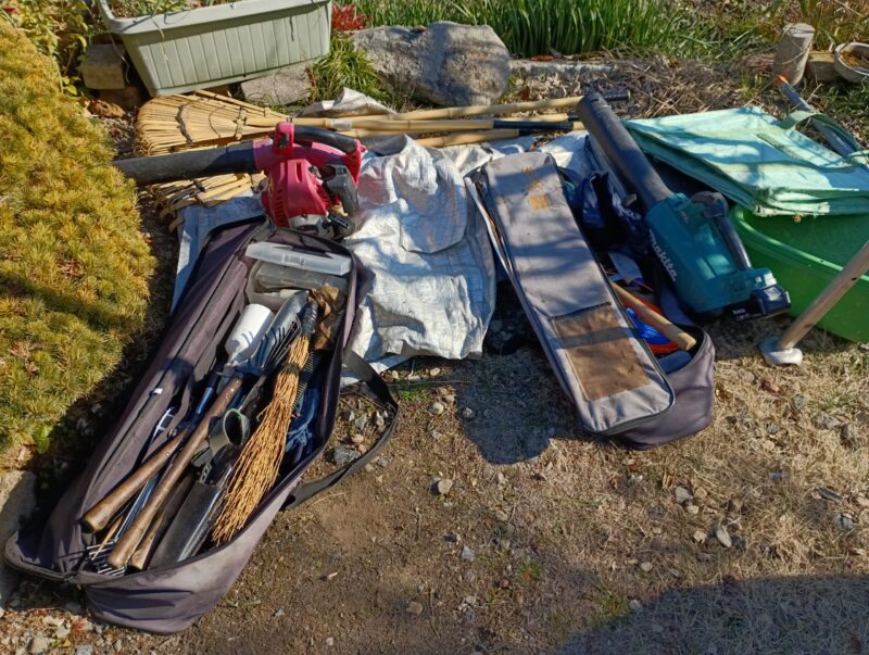 使い込んだ植木屋さんの道具たち・・・わかりにくいですが、刃の部分は刀の如く研がれております😱