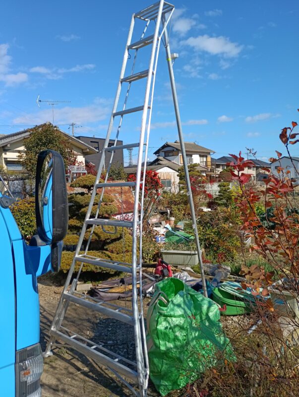 これが植木屋さんの脚立です。高さが10尺(約3m)もあります😲